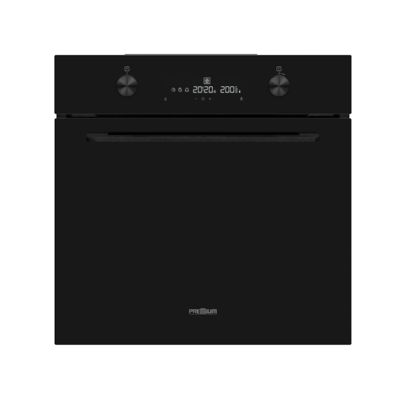 Four électrique 60 cm -  Cavité 69 litre - Classe A - 10 programmes avec afficheur - chaleur tournante - Afficheur numérique avec 2 boutons - porte froide - Verre FULL BLACK - 1 grille chromé, 2 plateaux émaillés - ventilateur de refroidissement - Auto nettoyant - Couleur: Noir - Garantie: 2ans