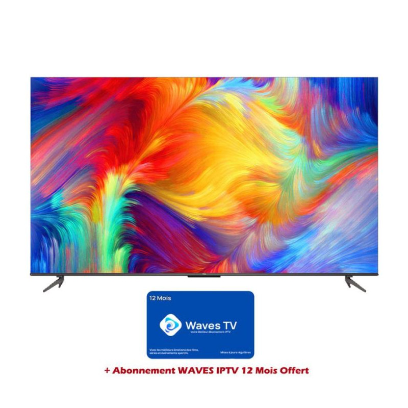 Tv TCL 65" Smart P735 4K UHD - Résolution: 3840 x 2160 pixels - Système d’exploitation: Android - Ratio d'aspect: 16:09 - Dolby Vision - Dolby Atmos - HLG - HDR 10 - effet Miroir - Technologie Wide Color Gamut(Plus d'un milliard de couleurs) - MEMC: réduit les flous d'affichage de mouvement - Puissance sonore: 2 x 15W - Google Assistant, Alexa - Communication vidéo Google Duo - Connectivité: Wi-Fi 2.4G/5G, Bluetooth 5.0 - Connecteurs: 3 x HDMI 2.1, 1 x USB, 1 x LAN RJ45, 1 x Prise casque - Garantie: 2 ans