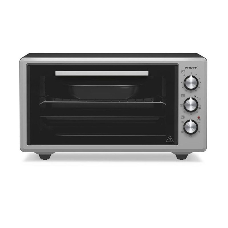 Four Électrique PROFF - Volume: 45 Litres - Puissance: 1400 Watts - Thermostat Réglable: Jusqu'à 230°C - Minuterie réglable: 90 min - Arrêt automatique - Chaleur tournante - 6 Fonctions - Fonction Yaourt - Cavité Emaillée - Nettoyage a Vapeur - Thermostat capillaire - Alimentation: 220-240V/50-60hz - 1 x Grill - 1 x Plateau - Couleur: Gris - Garantie 1 an