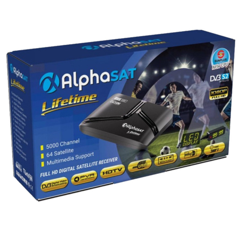 Récepteur AlphaSat Lifetime - Résolution : Full HD 1080 - Comptabilité: Wifi, DVB, PVR, HDTV, USB 2.0, Media player, DiseqC 1.2 - 5000 Channels - 64 Satellite - MultiMedia Support - Display LED - Voltage : 100-240 V - Fréquence : 50 Hz - Dolby Digitale - Avec 1 Commande - Couleur : Noir - Garantie :1 an