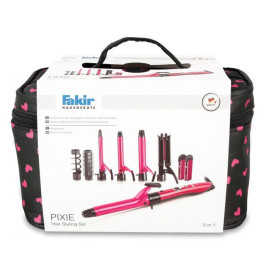 Coffret Fer à Boucler 5en1 Fakir PIXIE - Puissance 62W - Affichage de fonctionnement LED - Câble d'alimentation rotatif à 360 ° - Température: 200 ° C - Plaques en céramique recouvertes de tourmaline - Adapté aux droitiers et aux gauchers - Matériau du corps: matière synthétique et acier inoxydable - Accessoires: Fer à friser avec 3 accessoires différents pour fer à friser, fixation brosse ronde, fixation de boucle en spirale, planches à enfiler, sac de rangement - Couleur: Rose - Garantie: 1 an