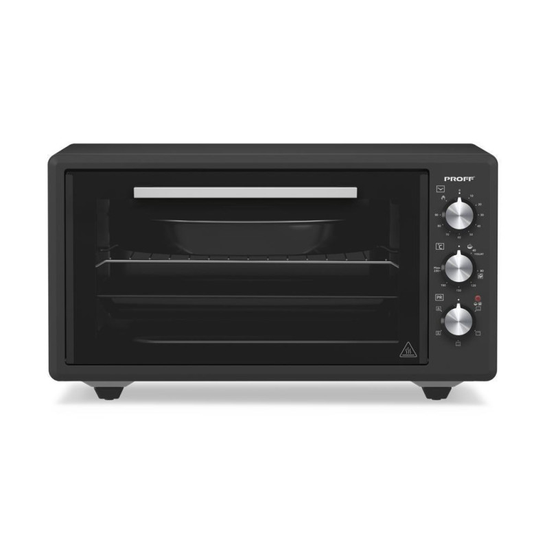 Four Électrique PROFF - Volume: 45 Litres - Puissance: 1400 Watts - Thermostat Réglable: Jusqu'à 230°C - Minuterie réglable: 90 min - Arrêt automatique - Chaleur tournante - 6 Fonctions - Fonction Yaourt - Cavité Emaillée - Nettoyage a Vapeur - Thermostat capillaire - Alimentation: 220-240V/50-60hz - 1 x Grill - 1 x Plateau - Couleur: Noir - Garantie 1 an
