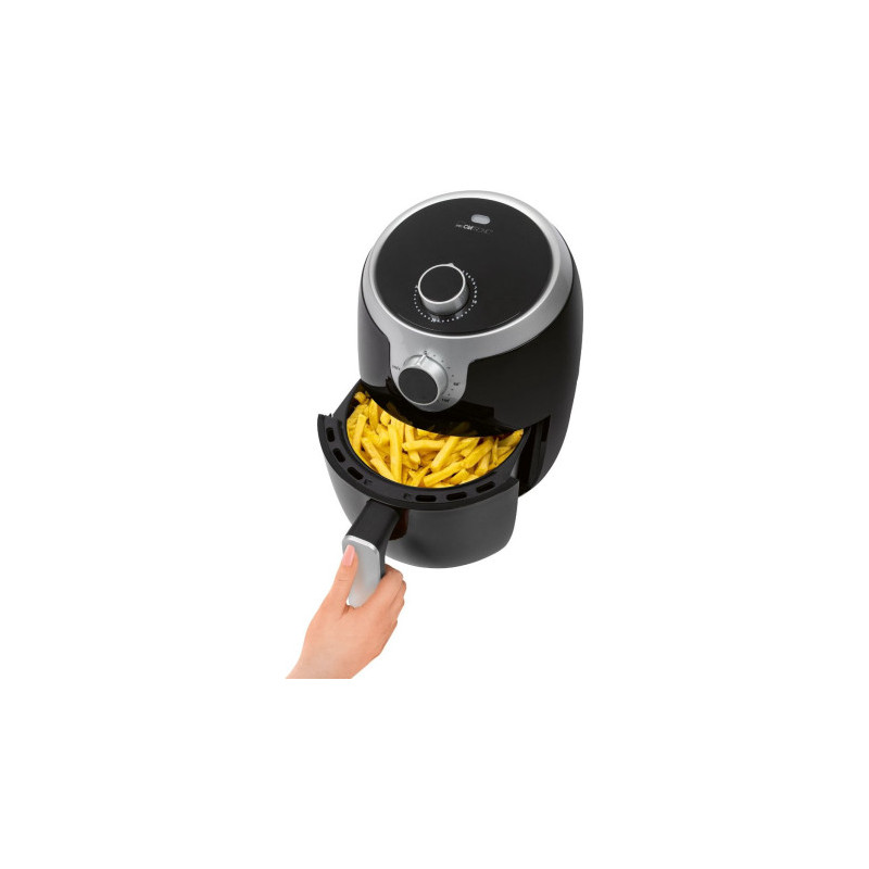 Friteuse À Air Chaud CLATRONIC FR3769H - Puissance : 1000W - Capacité 1.8L - Thermostat réglable en continu (80 °C – 200 °C) - Minuterie 30 minutes - Alarme de fin de cuisson - Arrêt Automatique  - Préparation rapide et économe en énergie - Protection anti surchauffe : interrupteur de sécurité - Faible émission de fumées et d’odeurs - Poignée tactile cool