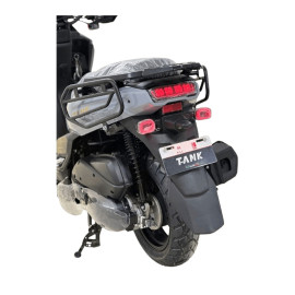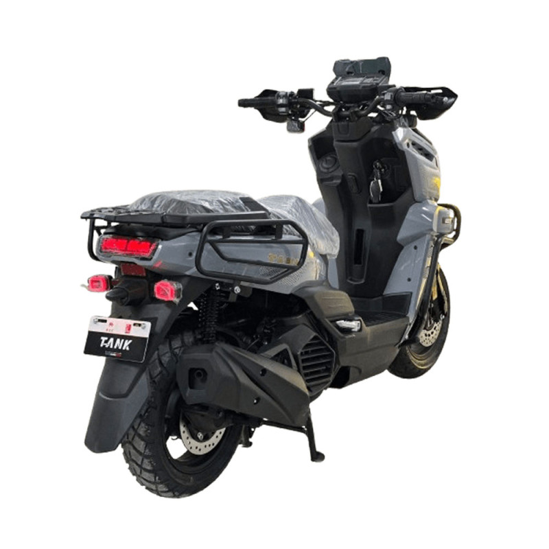 Scooter TANK 125CC-Moteur : Monocylindre 4 temps GY6, refroidissement par air –Cylindrée : 125cc –Puissance max. : 6.0 kW à 7500 tr/min –Couple max :8 N.m à 6000 tr/min –Consommation : seulement 2.6 L/100 km – Vitesse max: 80 km/h –Transmission : Automatique (CVT) –Allumage : CDI– Capacité du réservoir : 6.5 L – Démarrage rapide et efficace, idéal pour les trajets quotidiens –Suspension avant : Fourche télescopique hydraulique –Suspension arrière : Amortisseur hydraulique simple –Freins : Disques à l’avant et à l’arrière pour un freinage performant – pneus larges : 130/70-12 pour une meilleure tenue de route – Hauteur de selle : 790 mm – idéale pour une conduite accessible et confortable – Poids à vide : 117 kg -Charge maximale : jusqu’à 150 kg – L x l x H: 1930 x 715 x 1210 mm – Empattement : 1305 mm -Garantie : 3000 km