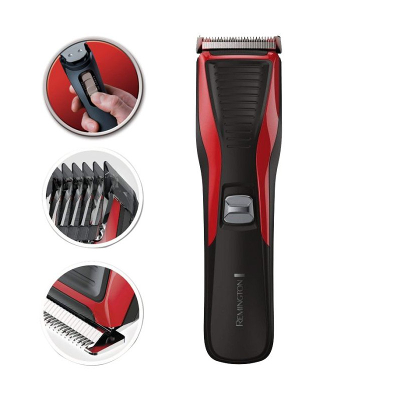 Tondeuse à Cheveux REMINGTON PRO MY GROOM - Alimentation: Secteur - Moteur Pro Power 2X plus rapide par rapport à une tondeuse cheveux Standard - Réglalge de coupe ajustable 12 hauteurs (de 1 mm à 23 mm) - lames en acier inoxydable auto-affûtantes - Bouton marche/arrêt - Brosse de nettoyage - Utilisation facile et coupe précise - - Poids: 660 gr - Couleur: Rouge - Garantie: 2 ans
